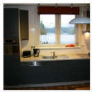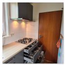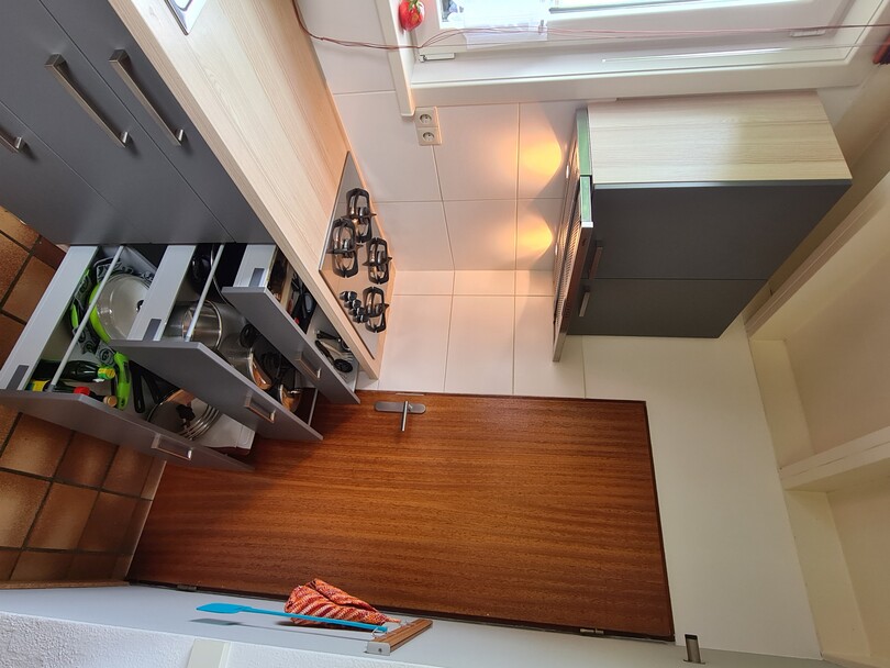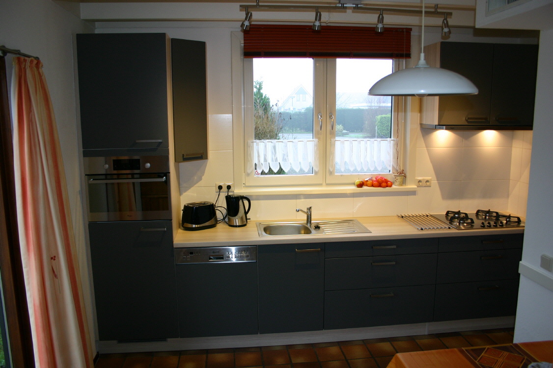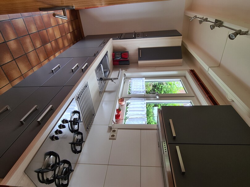 neu gestaltete Küche mit reichhaltiger Ausstattung an Kochutensilien, Geschirr