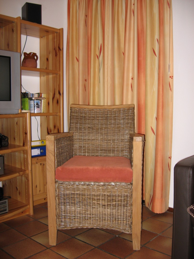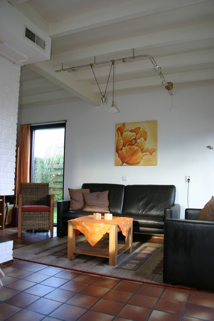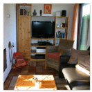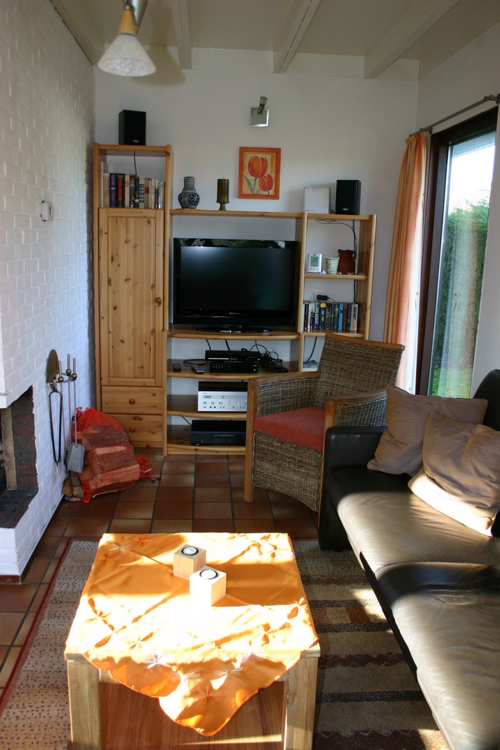 Wohnbereich mit gemütlicher Ledercouch, TV mit SAT-Receiver und Blue-Ray-Player